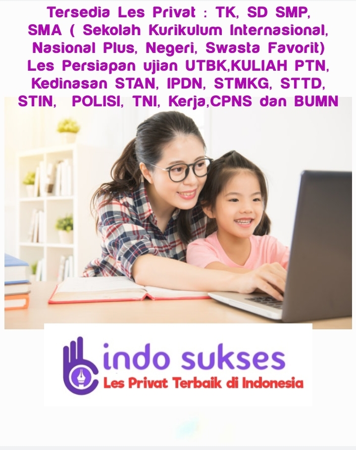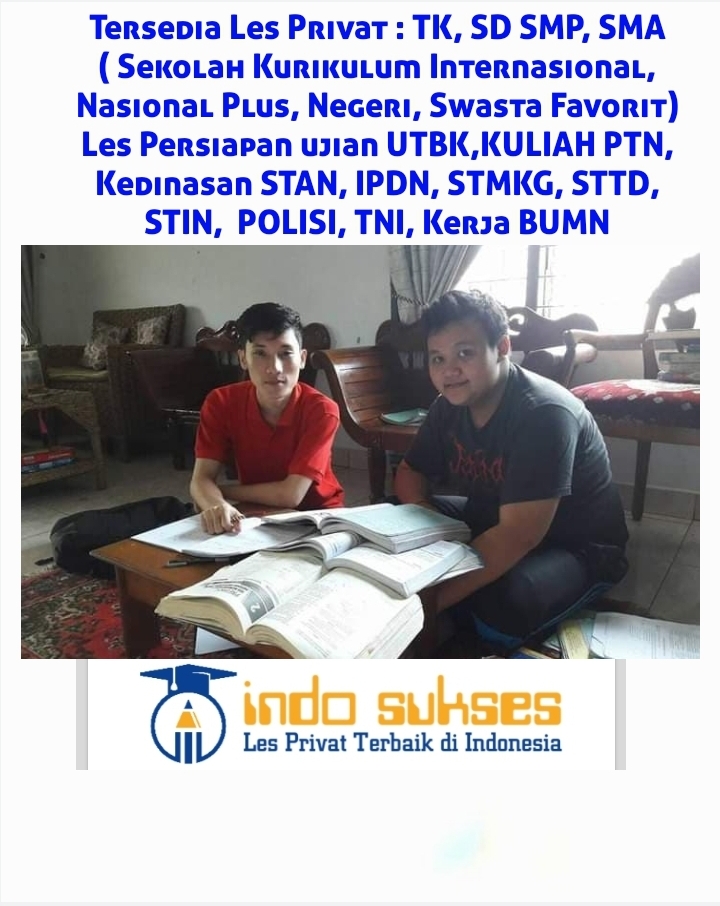 INDO GO SUKSES adalah Pusat Penyedia Jasa GURU LES PRIVAT TERBAIK & TERBESAR DI KOTA MEDAN, SIANTAR, BINJAI, TEBING TINGGI PUSAT LES PRIVAT TERKENAL & BERKUALITAS TERPERCAYA. Pengajar yang TERUJI PUNYA Pengalaman hebat yang akan datang ke Rumah Anda. Tentunya akan mengajar secara Profesional, Sopan, ngajar nya SERU. Tersedia untuk tingkat TK, SD, SMP, SMA, UN, UTBK- SBMPTN, SIMAK UI,Kedinasan STAN,IPDN, STTD, POLTEKIP, POLTEKIM, STIN, STIS, CPNS, AKPOL dan AKMIL, baik kurikulum Nasional maupun kurikulum Internasional meliputi seluruh daerah JABODETABEK. Guru Les Privat kami berasal dari guru Profesional dari sekolah nasional dan internasional, Lulusan Universitas terbaik seperti UI, UGM, ITB, IPB, STAN, Unpad, Undip, Tokyo University, National University Of Singapore, National University of Australia, dan universitas lainnya yang telah terseleksi dan berpengalaman. INDO SUKSES Terbukti berhasil membimbing siswa-siswa masuk perguruan tinggi Kebanggaan, masuk SMP/SMA Favorit, memperoleh nilai KELULUSAN UN yang SANGAT MEMUASKAN dan Siswa mendapat nilai ulangan dan nilai rapor yang bagus. BAHKAN RIBUAN MURID KAMI TELAH BERHASIL LULUS MERAIH KARIR IMPIAN TERBAIKNYA. Konsep pembelajaran sesuai dengan kurikulum yang diajarkan di sekolah, tentunya diajarkan dengan Cara se kreatif mungkin sehingga anak mudah mengerti Pelajaran yang disampaikan.Pengajar yang TERUJI PUNYA Pengalaman hebat yang akan datang ke Rumah Anda. Tentunya akan mengajar secara Profesional, Sopan, ngajar nya SERU. Tersedia untuk tingkat TK, SD, SMP, SMA, UN, UTBK- SBMPTN, SIMAK UI,Kedinasan STAN,IPDN, STTD, POLTEKIP, POLTEKIM, STIN, STIS, CPNS, AKPOL dan AKMIL, baik kurikulum Nasional maupun kurikulum Internasional